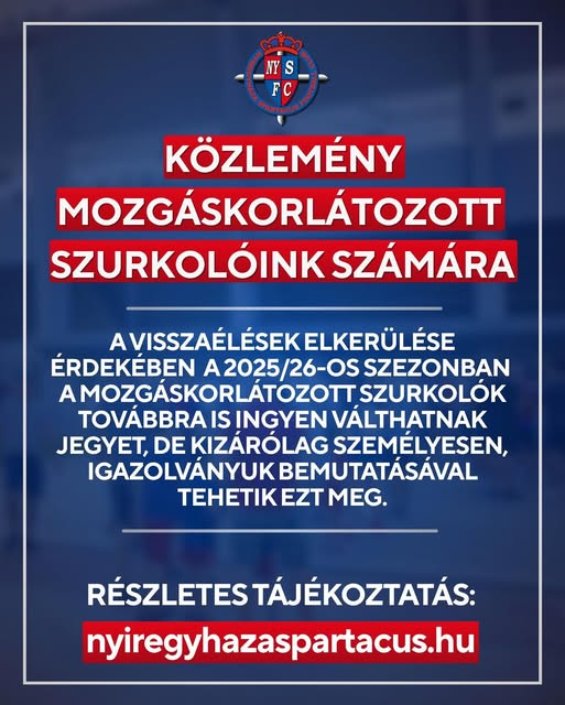 Ezért döntöttünk úgy, hogy az idei (2025/26-os) szezonban mozgáskorlátozott szurkolónk és kísérője is 50%-os áron tudja megváltani jegyét/bérletét, hogy elkerüljük azt a helyzetet, hogy jogosulatlan szurkolók váltsanak oda jegyet.