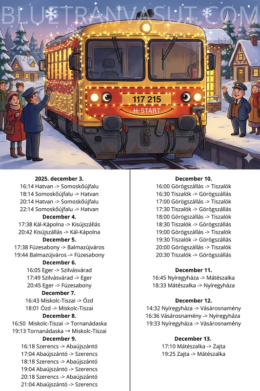 A Blue Train oldala tájékoztatott arról, hogy a FényBz. merre teszi tiszteletét a következő napokban. Ez már újabb, tervezett menetrend. Ez egyelőre december 13-ig szól, az ezután követő napok járatairól később lesz információ. (A menetrend forrása: https://www.mavcsoport.hu/fenyjarmuvek