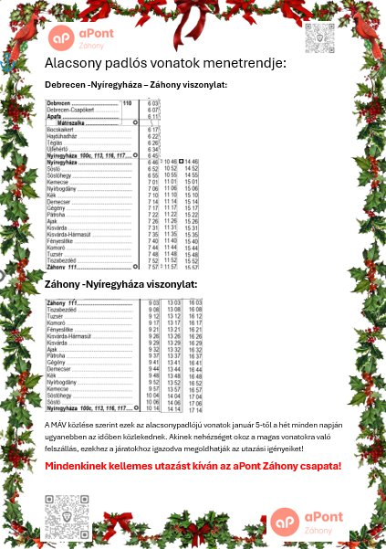 A Debrecen-Nyíregyháza-Záhony vonalon összesen három-három ilyen járattal találkozhatunk, ebből egy indul Debrecenből, a másik kettő “csak” Nyíregyházáról. Íme az aPont által közzétett alacsony padlós menetrend.